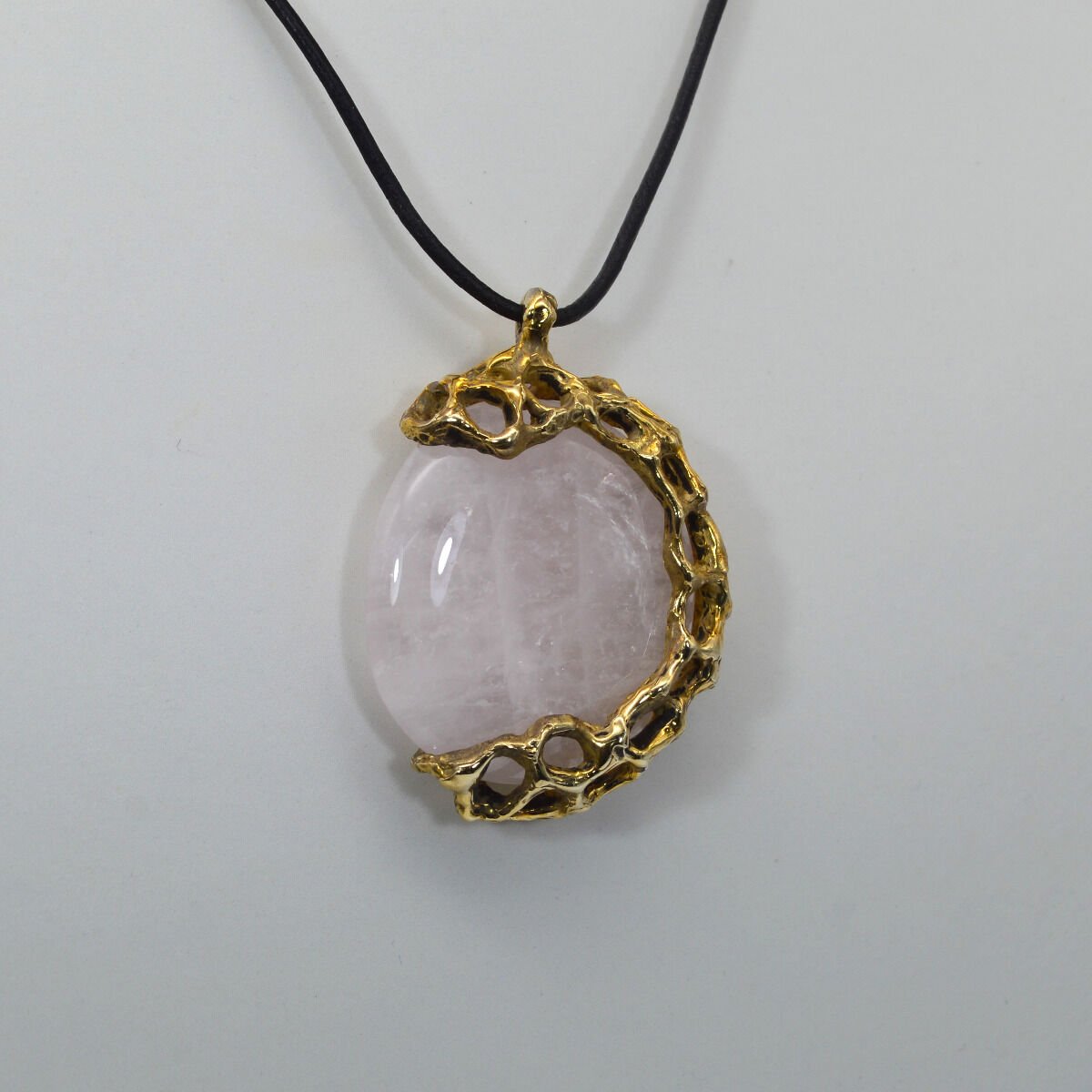 Use this Rose Quartz pendant mounted in brass made entirely by hand, hang this pendant to enjoy the properties of rose quartz.