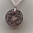 Este modelo de orgonita colgante, es un modelo clásico, su composición es resina de poliéster con virutas de metal (aluminio), en una proporción al 50%, y un cuarzo en su interior. Color rosa suave.